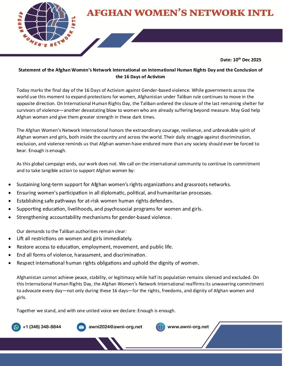AWNI’s advocacy work includes international campaigns and women’s rights initiatives.